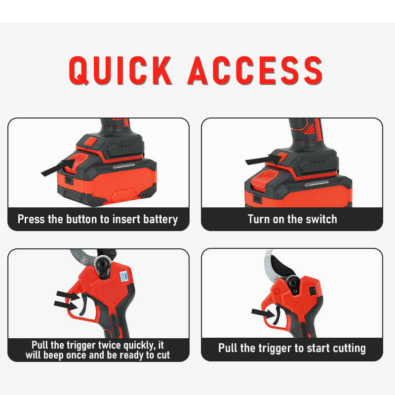 이 휴대용 전기 전정 가위는 45mm 절단 범위와 내구성이 뛰어난 브러시리스 모터를 결합하여 가지 절단을 위한 강력하고 안정적인 성능을 제공합니다. 과수원 전정, 나무 관리 및 정원 유지 관리에 적합합니다.